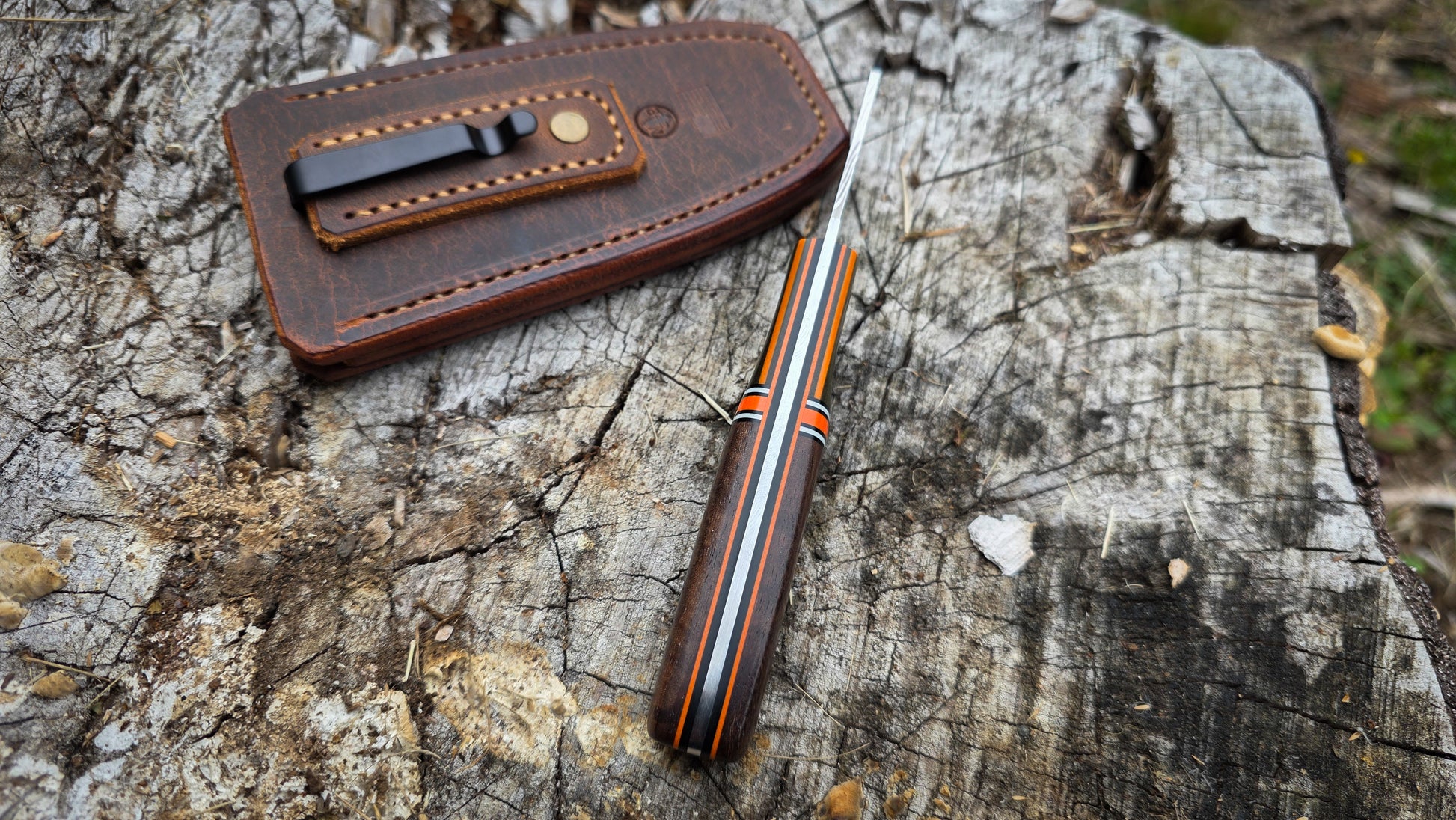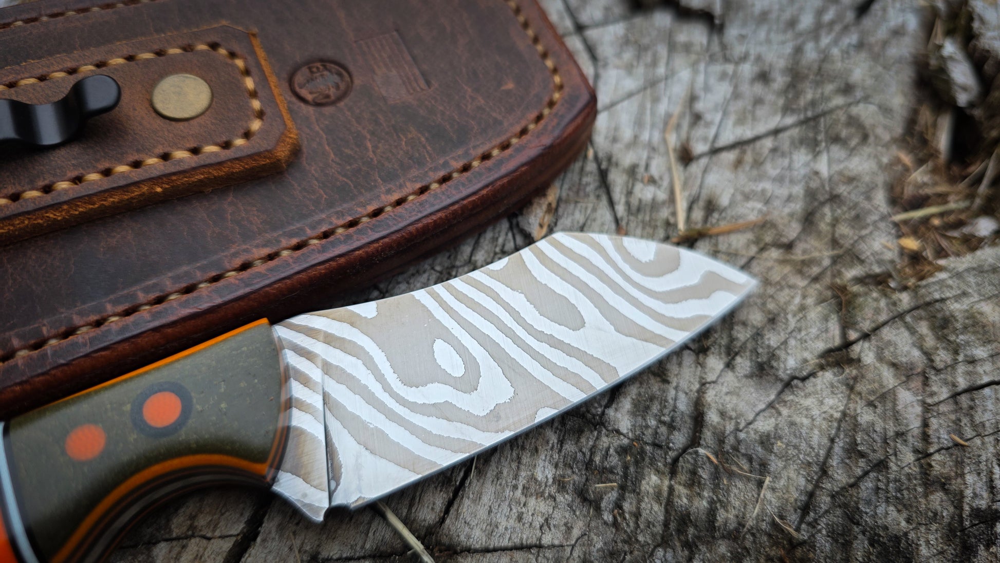 One of my favorite EDC designs, this Hoodoo Mini is ready for your pocket! Low layer twist damascus forged in house, with a satin/polish blade. Nice and thin behind the edge for all your slicing tasks. The handle scales are made by underthebridgescales with a Gcarta Green Line Paper micarta front bolster, orange g10 spacer, Bastogne Walnut rear, with orange, black, and white accents. Its all held together with hidden rear brass hardware, and g10 front pins. Comes with ambidextrous Water Buffalo sheath, that can be clipped in either pocket, or to your belt.